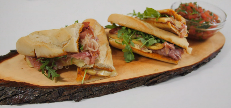 7. Remove the bocadillos from the pan, open the sandwich, and top off with fresh arugula & a spoonful of the combined parsley, tomato, and olive oil.