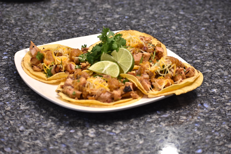 9. Serve meat up hot on a warmed tortilla topped with freshly chopped cilantro, diced grilled pineapple, sliced red onion, and a lime wedge.